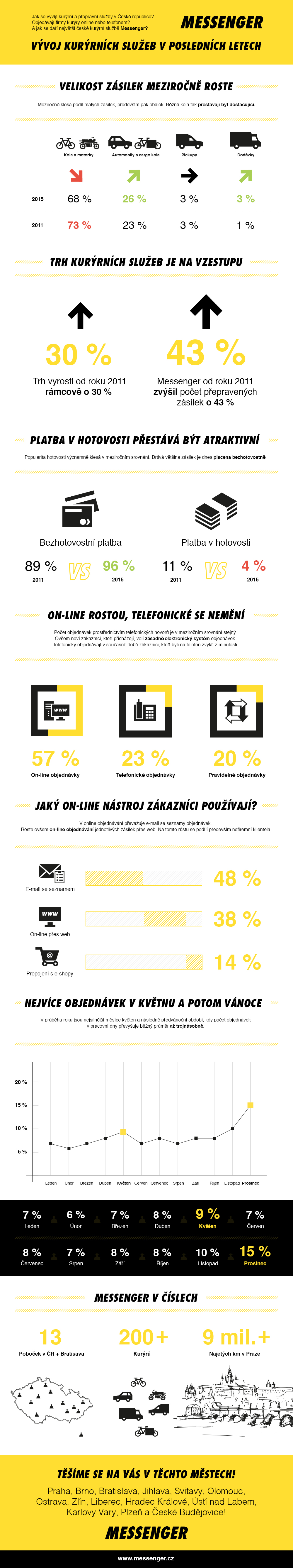 Nejvýznamnější změnou trhu je ústup malých zásilek, což znamená méně kol a skútrů, naopak roste počet objemných zásilek pro cargo kola, automobily a dokonce dodávky. „Doba, kdy kurýrní služby převážely výhradně obálky s dokumenty, jsou již pryč. V městské dopravě se kurýrní služby přizpůsobily a začaly převážet také větší zásilky a více se tak uplatňují cargo kola a automobily,“ vysvětluje Kateřina Ovesná, ředitelka obchodu a marketingu Messengeru. Přeprava prostřednictvím kol se sice v roce 2015 u Messengera podílí 68 procenty, ovšem v roce 2011 byly koly realizovány skoro tři čtvrtiny zásilek. Největší nápor zásilek přichází v květnu a následně v listopadu a prosinci. Poslední dva měsíce v roce Messenger realizuje na čtvrtinu ze všech ročních objednávek.